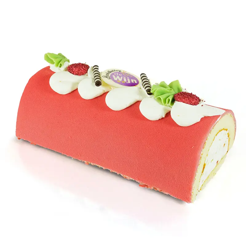Een halve cilinder van luchtige cake gevuld met een volle bavaroise barstens vol met itterkoekjes, amarenenkersen, rozijntjes, perzikstukjes, bigarreux. Overdekt met een dun laagje marsepein en daarna vrolijk versierd